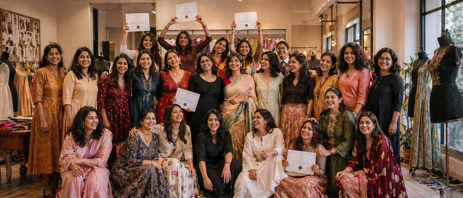 Patterns, draping, portfolio aur placement β from home, in Hinglish. NID & NSDC certified. 2,000+ mahilaein already earning.